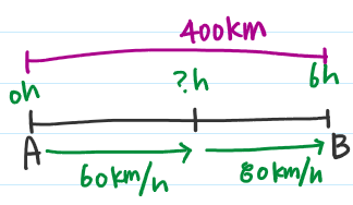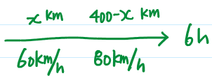 자동차로 A지점에서 출발하여 시속 60km로 가다가, 시속 80km/h로 바꿔서 B지점에 도착하였더니 총 6시간이 걸렸다.