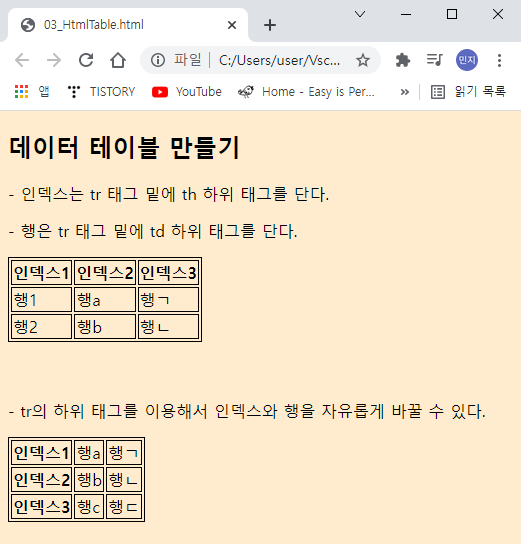 <p>- tr의 하위 태그를 이용해서 인덱스와 행을 자유롭게 바꿀 수 있다.