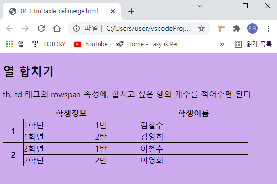 <p>th, td 태그의 rowspan 속성에, 합치고 싶은 열의 개수를 적어주면 된다.</p>