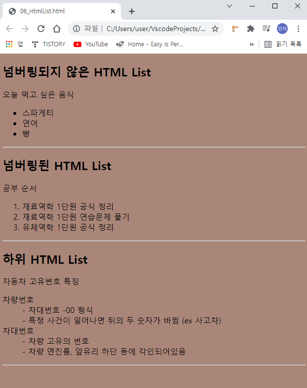 - 넘버링되지 않는 리스트를 만들 때는, ul 태그의 하위로 li 태그를 사용한다.