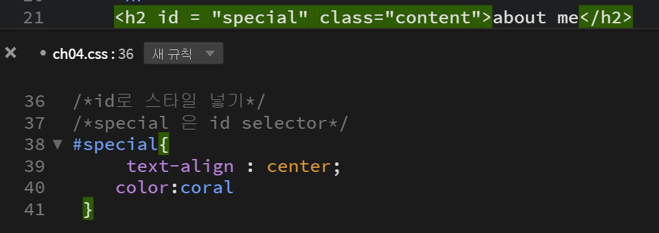 id 셀렉터랑 class 셀렉터 두개 다 썼을 때, 프로그램은 class 셀렉터의 코드를 선택한다.