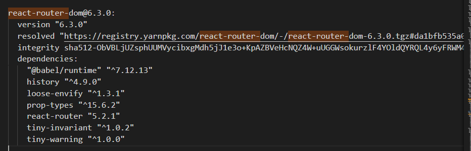 작업 폴더의 yarn.lock 파일에서 react-router-dom을 검색해줍니다.