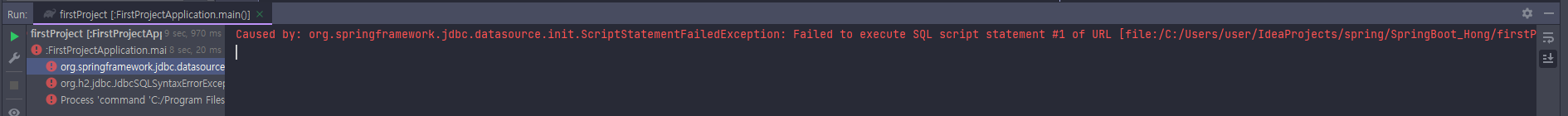Caused by: org.springframework.jdbc.datasource.init.ScriptStatementFailedException: Failed to execute SQL script statement #1 of URL [file:/경로/data.sql]: INSERT INTO article(id, title, content) VALUES (1,'가가가가','1111'); nested exception is org.h2.jdbc.JdbcSQLSyntaxErrorException: Table "ARTICLE" not found; SQL statement: