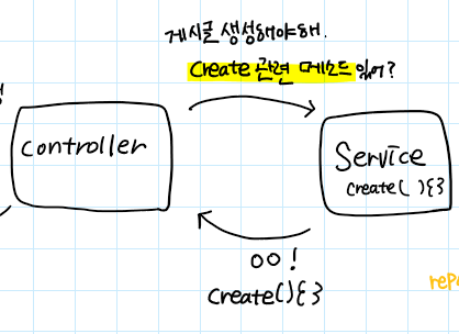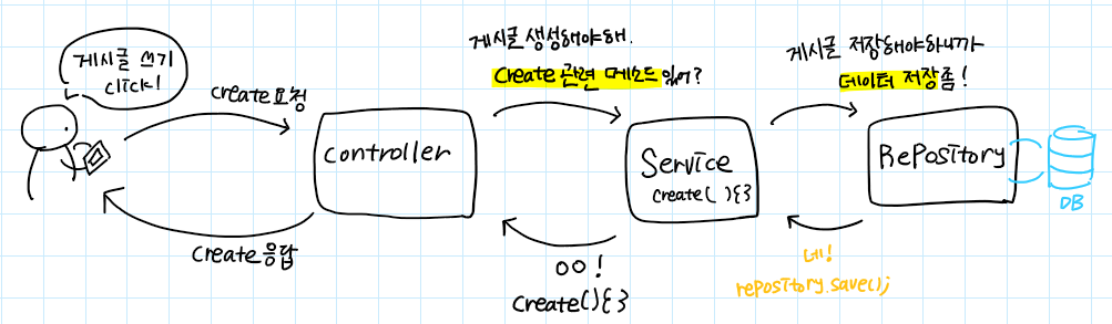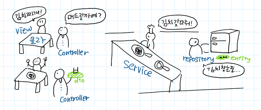주문을 받은 웨이터(Controller) 는 요리사(Service) 에게 김치찌개 만드는걸 요청한다.