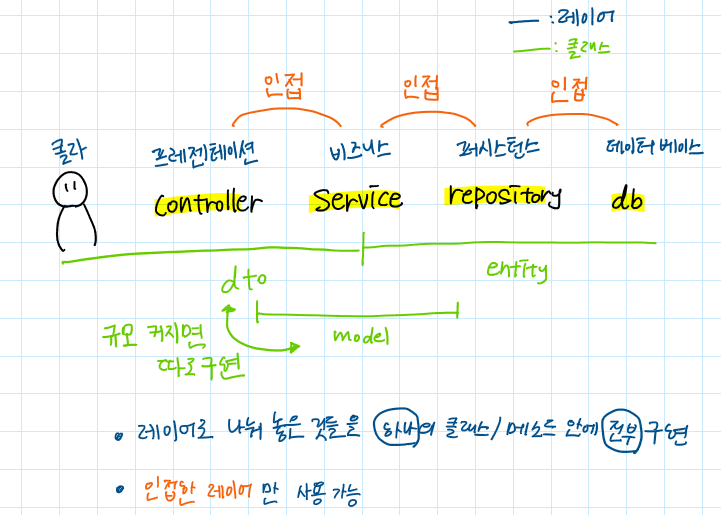 1. 나눠진 레이어는, 코드 구현 시 하나의 클래스, 하나의 메소드 안에 전부 구현해야 한다.