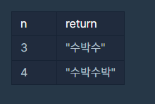 길이가 n이고, "수박수박수박수...."와 같은 패턴을 유지하는 문자열을 리턴하는 함수, solution을 완성하세요. 예를들어 n이 4이면 "수박수박"을 리턴하고 3이라면 "수박수"를 리턴하면 됩니다.