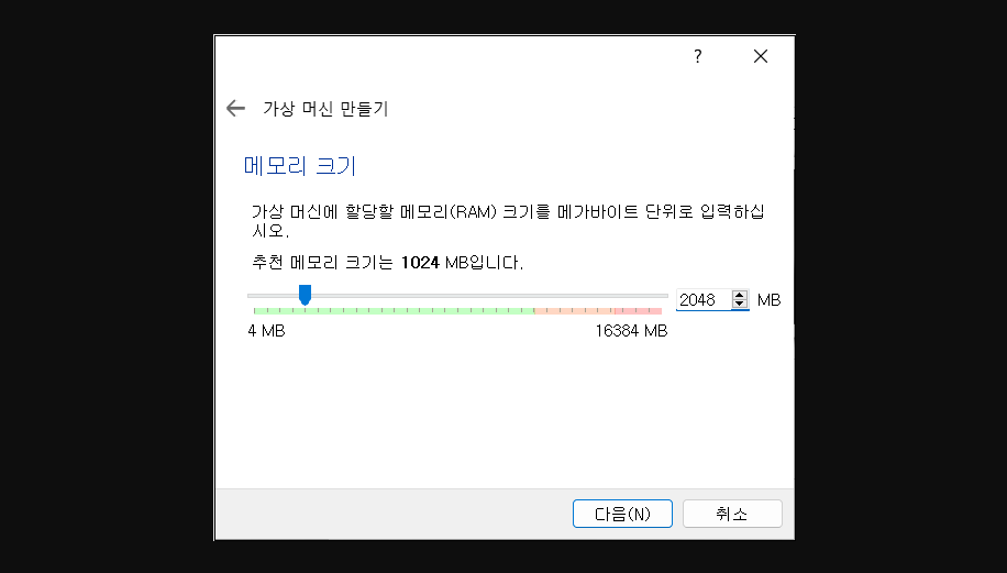3. 적당한 메모리 크기를 설정 후 다음 버튼을 클릭한다.