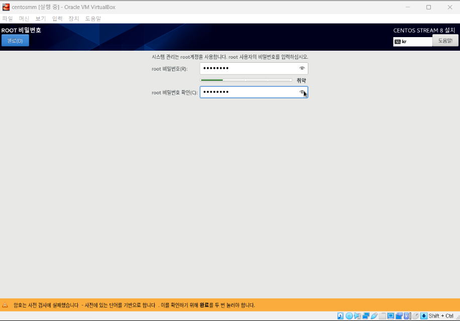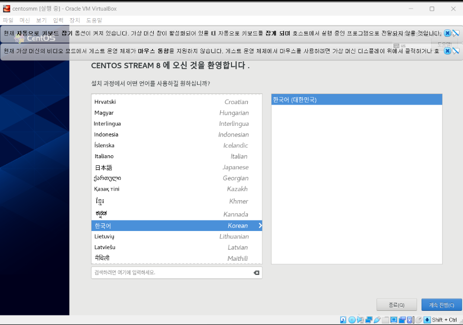 1. 가상os 가 부팅된 후 언어를 '한국어'로 설정해준다.