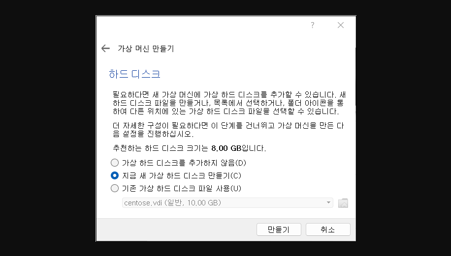 4. 하드 디스크 선택 창에서 '지금 새 가상 하드 디스크 만들기'를 클릭한다.