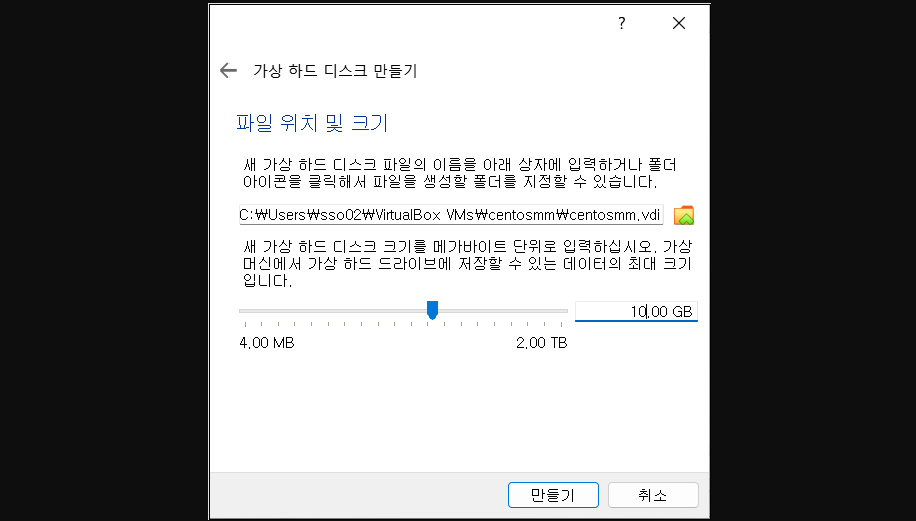 6. 원하는 vid 저장 경로 선택 후 가상 하드 디스크 크기를 선택해준다.