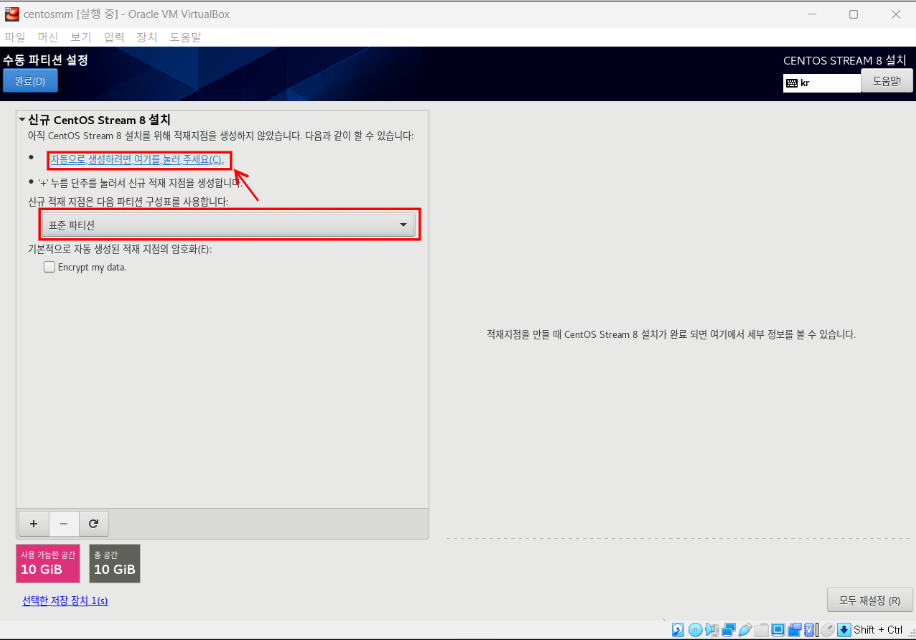 신규 적재 지점을 '표준 파티션'으로 선택 후 '자동으로 생성하려면 여기를 눌러주세요' 글씨를 클릭해준다.