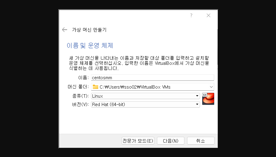 2. 원하는 가상머신 이름을 입력한 후, 종류는 Linux, 버전은 RedHat(64-bit) 를 선택해준다.