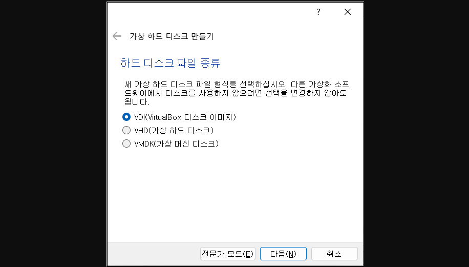 4-1. 가상 하드 디스크 파일 형식은 VDI 로 선택해준다.