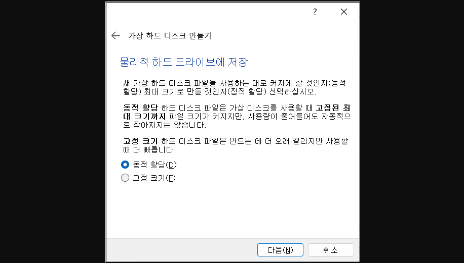 부모 컴 용량이 넉넉할 경우에는 가상컴 용량을 엄청 크게 해놓고 고정크기 하면 빠르게 이용 가능하다.