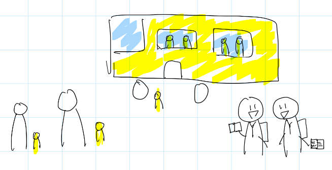 노란색 교복을 입고있는 유치원생들이 엄마 손을 잡고 리라유치원 버스에 타고있는 모습