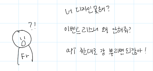 그런데 중간에 껴있는 애매한 상황이 너무 불편해서 다시 백앤드로 돌아갔었다.퍼블리셔가 대충 만들어준 이벤트를 다시 수정해서 사용해야되면서백앤드가 컨벤션 없이 던져준 응답을 끼워맞추기해야되는 그 불편함때문에