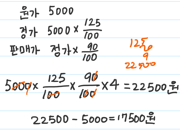 | 원가가 5000원인 물건 가격을 25%올려 판매하였을 때, 팔리지 않아 다시 10% 인하하여 팔았다. 물건 4개를 팔았다고 할 때, 이익은 얼마인가? ![]() 17500원입니다. |