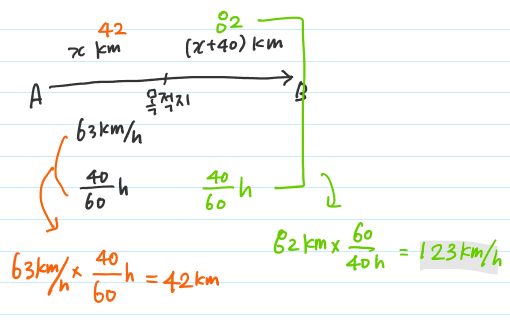 | A와 B가 목적지를 향해 가고 있다. 목적지는 B보다 A와 40km더 가깝고, A가 시속 63km의 일정한 속력으로 달리면 40분만에 도착한다. B가 A보다 늦게 도착하지 않으려면 B가 내야 할 최소 속력은? ![]() 일단 문제에 나온 정보들을 적어줍니다. ![]() 그리구 풀어줍니다. |